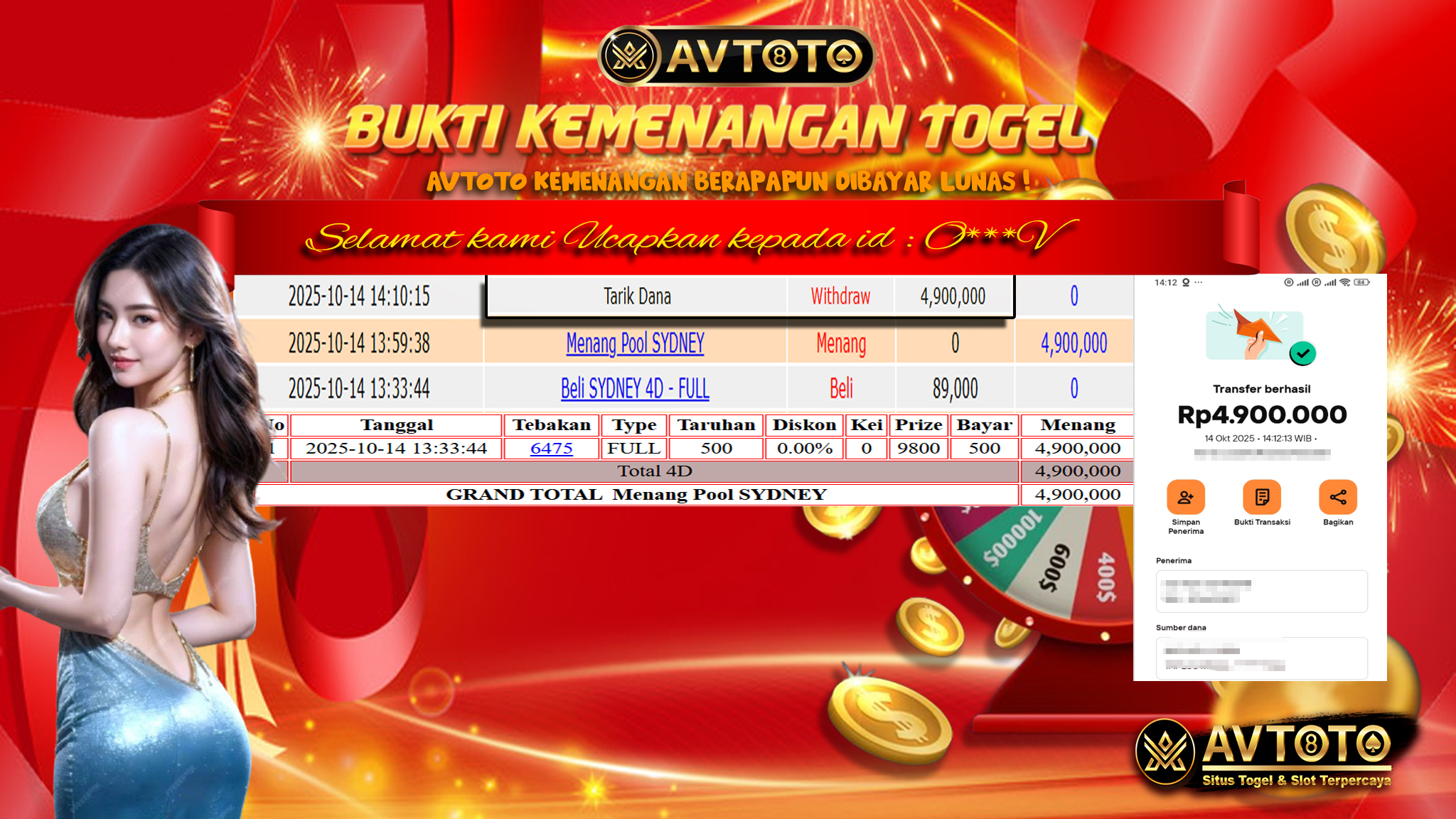 SELAMAT KEPADA USER ID : O*****V TELAH JACKPOT DI TOGEL SIDNEY LOTO AVTOTO 4.9 JUTA!!!